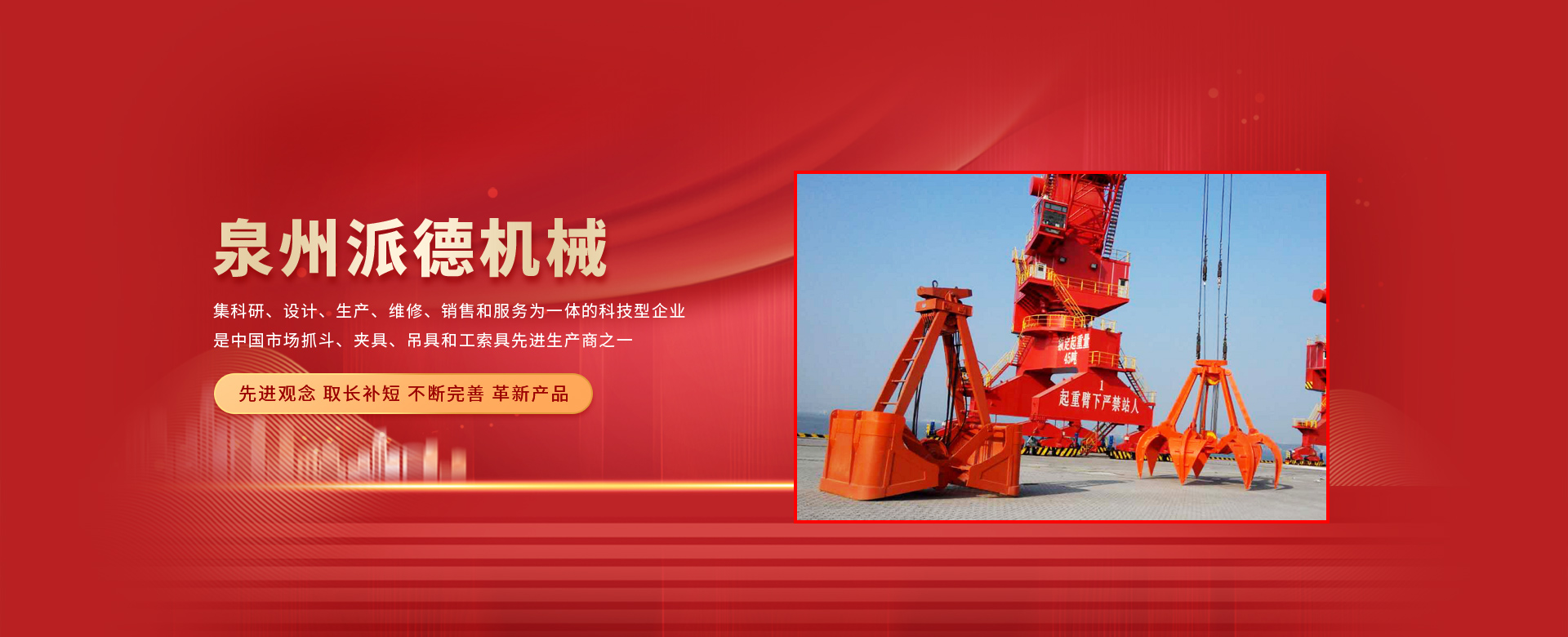 泉州派德機械有限公司成立于2012年5月,位于全國文明的古城福建泉州,公司擁有各類型專業員工82人,其中高級工程師1人,工程師4人,助理工程師5人,是一家集科研、設計、生產、維修、銷售和服務為一體的科技型企業,是中國市場抓斗、夾具、吊具和工索具先進生產商之一。產品采用國內外先進的設計方案、技術規范、制造過程、工藝流程和服務,憑借在抓斗、夾具、吊具和工索具領域的超前設計理念和成熟的技術、工藝和管理,在抓具領域迅速崛起。